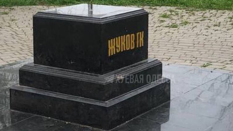 В Одесі місцева мешканка наклеїла прізвище та ініціали радянського полководця, маршала Радянського Союзу Георгія Жукова на місце, де раніше був його пам'ятник.