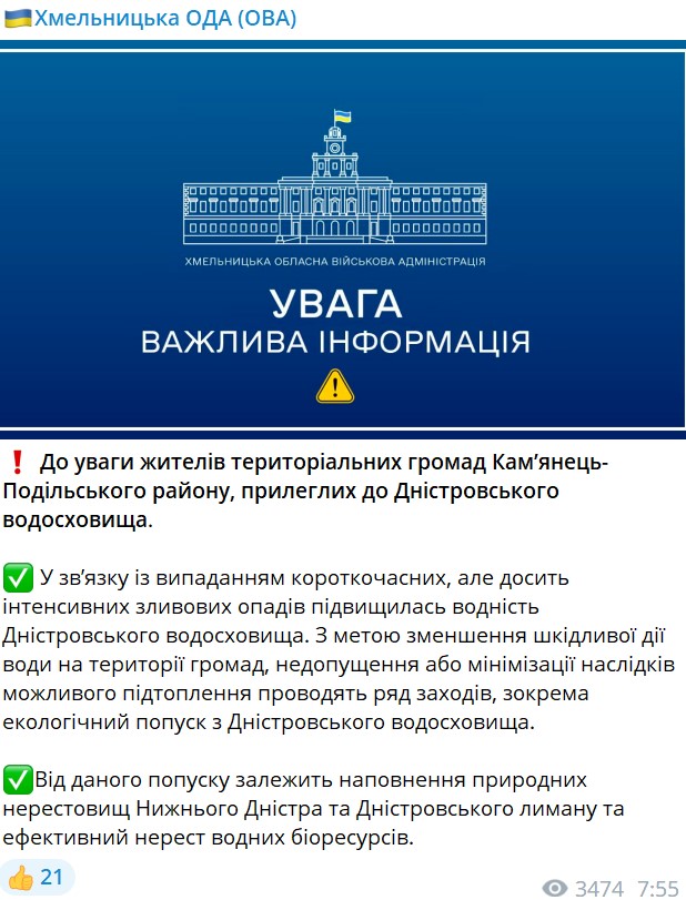 Від цього спуску води залежить наповнення природних нерестовищ Нижнього Дністра та Дністровського лиману та ефективний нерест водних біоресурсів, додали в ОВА.