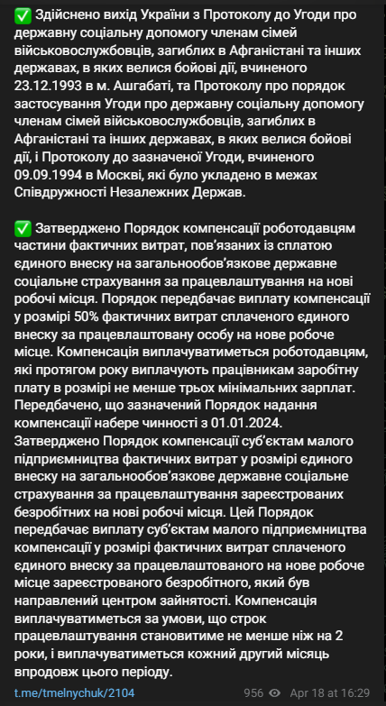 Кабінет міністрів України затвердив порядок компенсації роботодавцям частини фактичних видатків, пов'язаних зі сплатою єдиного внеску за працевлаштування на нові робочі місця.