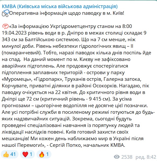 Синоптики прогнозували пік повені на 22 квітня. При цьому пізніше Укргідрометцентр заявив, що катастрофічного та масштабного затоплення у столиці не буде, оскільки вода почала відступати.