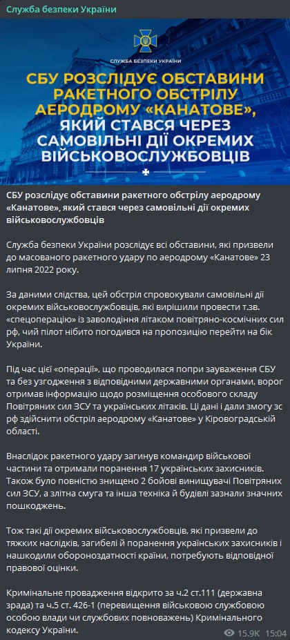 15.55 У СБУ офіційно підтвердили, що ведуть розслідування щодо самовільних дій військових, які призвели до ракетного удару по аеропорту "Канатове".