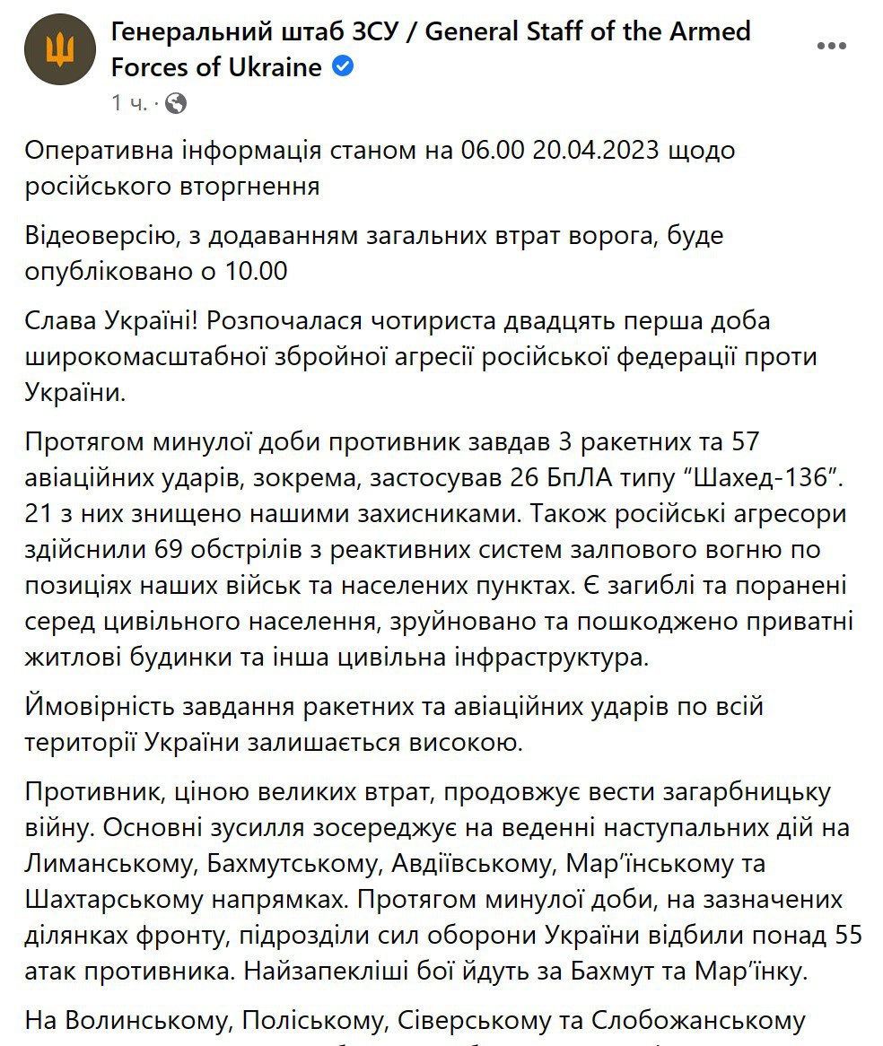Докладніше про те, що відбувалося вчора – читайте у підсумках за 19 квітня.