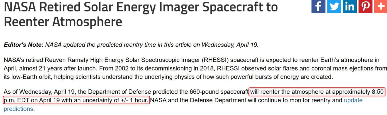 Що стосується супутника RHESSI, про ймовірне падіння якого вчора заявляла українська влада, то на сайті NASA опублікували час, на який було заплановано вхід апарату в атмосферу.