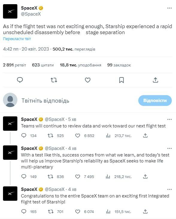 У SpaceX прокоментували подію. Там заявили, що робота над Starship продовжиться, будуть вивчені проблеми, що виникли при відділенні першого ступеня.