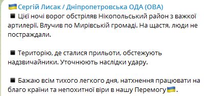 07.50 Вночі РФ обстріляла Нікопольський район із важкої артилерії. Постраждала Мирівська громада. На щастя, люди не постраждали.