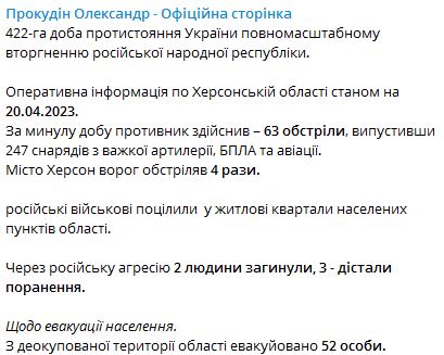 08.00 Минулої доби РФ 63 рази обстріляла Херсонську область, випустивши 247 снарядів з важкої артилерії, БПЛА та авіації.