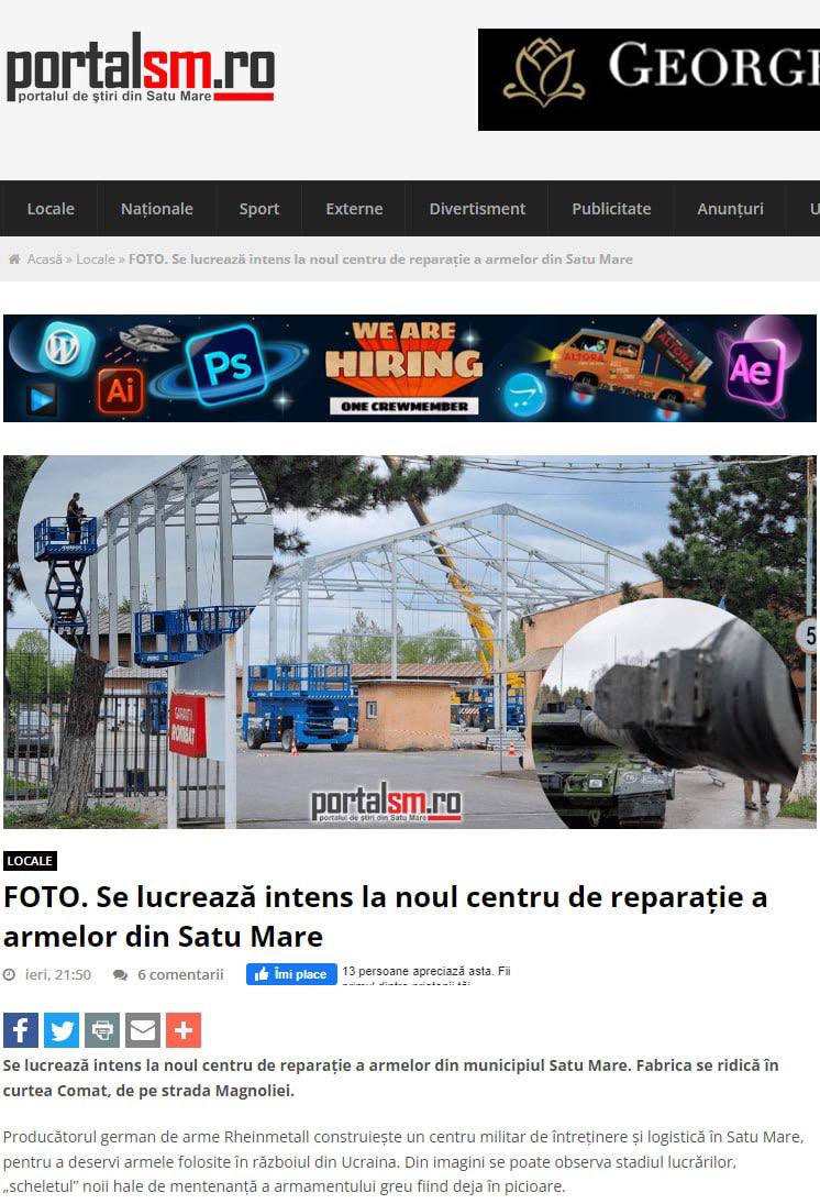 "Німецький виробник зброї Rheinmetall будує у Сату-Марі військовий центр технічного обслуговування та логістики для обслуговування зброї, яка використовувалася у війні в Україні. "Скелет" нового цеху обслуговування важкого озброєння вже стоїть, у новому центрі ремонту зброї йде інтенсивна робота", - повідомляє сайт Portalsm.