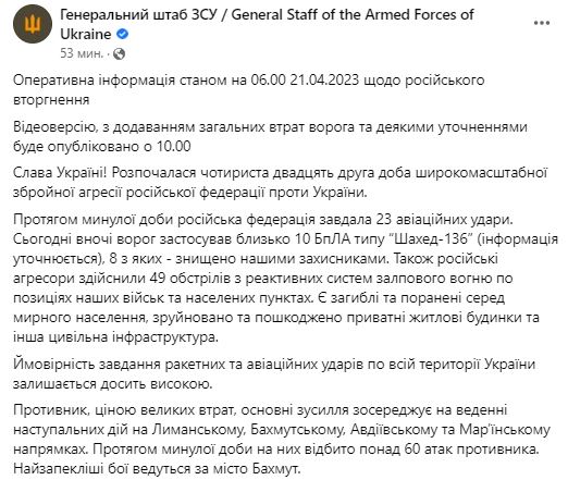 У п'ятницю, 21 квітня, Генштаб ЗСУ оприлюднив зведення про ситуацію на фронті.