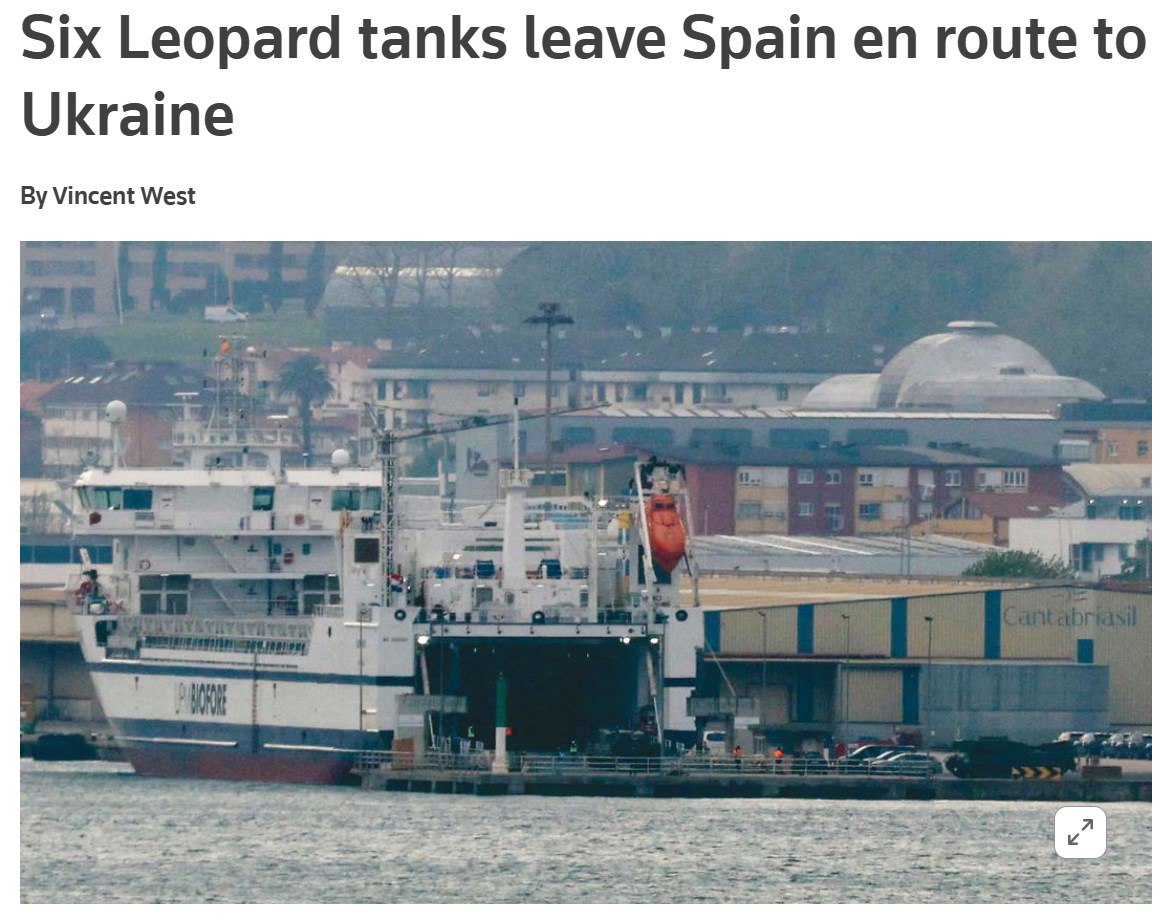 З Іспанії в Україну транспортують шість танків Leopard, процес передачі яких розпочали днями. Їх погрузили на вантажне судно у п'ятницю, далі їх відправлять морем до Польщі.