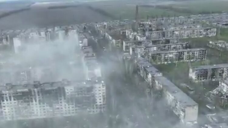 На кадрах видно, що від колись житлових багатоповерхових будинків залишилися одні руїни. Будинки вигорілі, майже зруйновані. Вікон у них немає. Навколо будинків пусто. Те, що залишилося від багатоповерхівок, у диму.