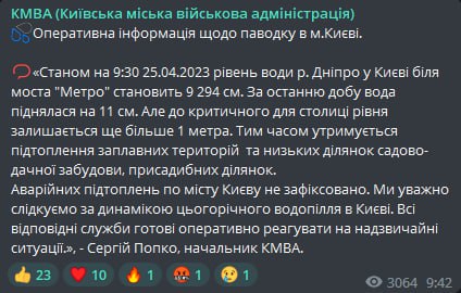 Днями начальник КДВА Сергій Попко заявляв, що влада міста та всі служби готові до потенційних надзвичайних ситуацій. Також говорилося, що передбачуваний максимальний рівень повені на Дніпрі в межах Києва не становить загрози промисловим об'єктам та житловим масивам.
