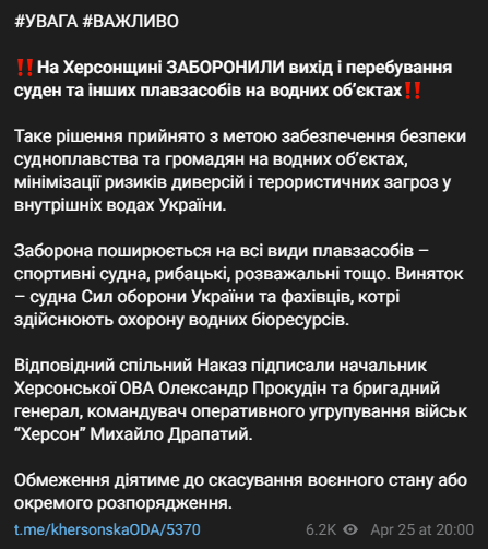 У Херсонській області заборонили вихід та перебування на воді човнів та інших плавзасобів.