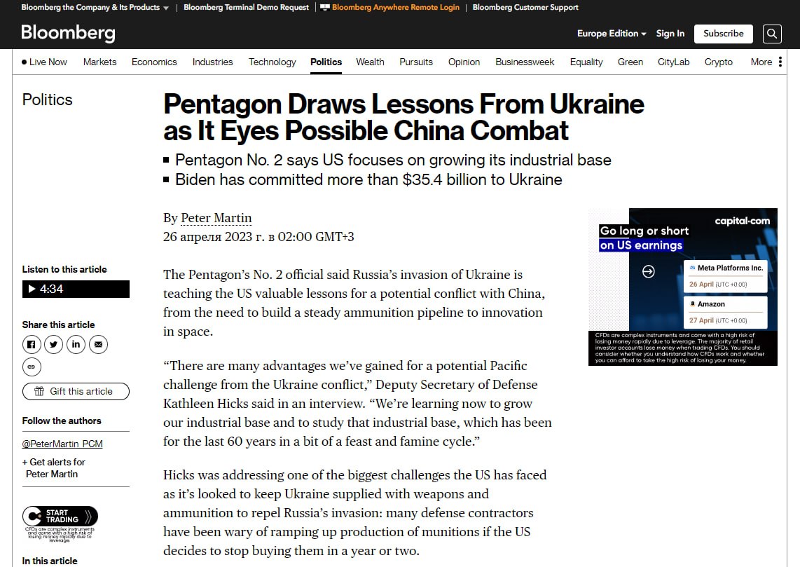 "Є багато переваг, які ми отримали для потенційного тихоокеанського конфлікту внаслідок українського конфлікту. Зараз ми вчимося розвивати нашу промислову базу та вивчати цю промислову базу, яка останні 60 років перебувала у циклі "бенкету та голоду", - заявила в інтерв'ю заступник міністра оборони. США Кетлін Хікс.
