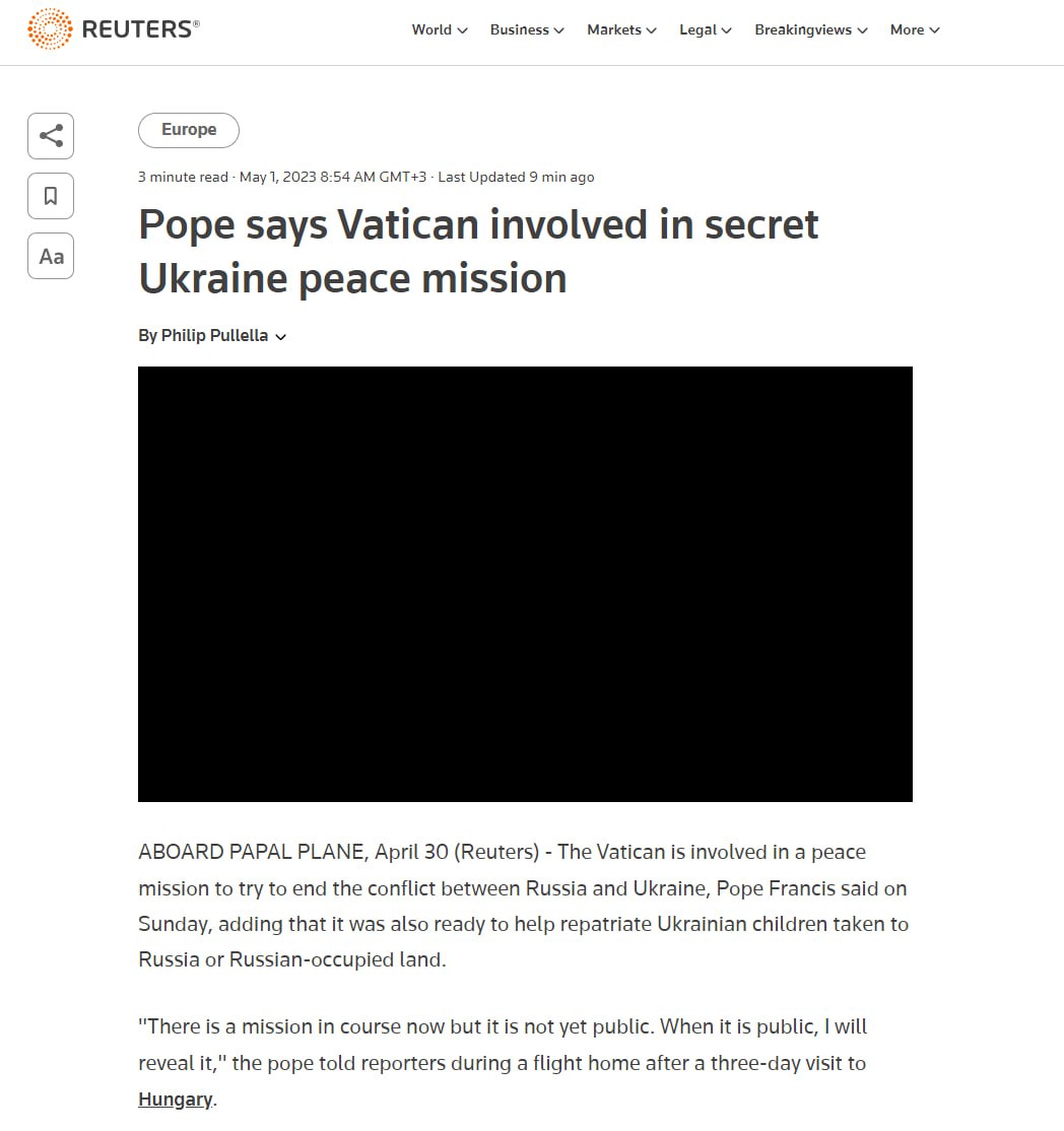 Папа Римський заявив, що Ватикан причетний до "секретної миротворчої місії в Україні".