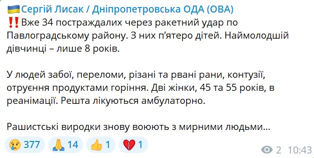 Число постраждалих внаслідок удару по Павлограду збільшилося до 34 осіб. У тому числі постраждали п'ятеро дітей.