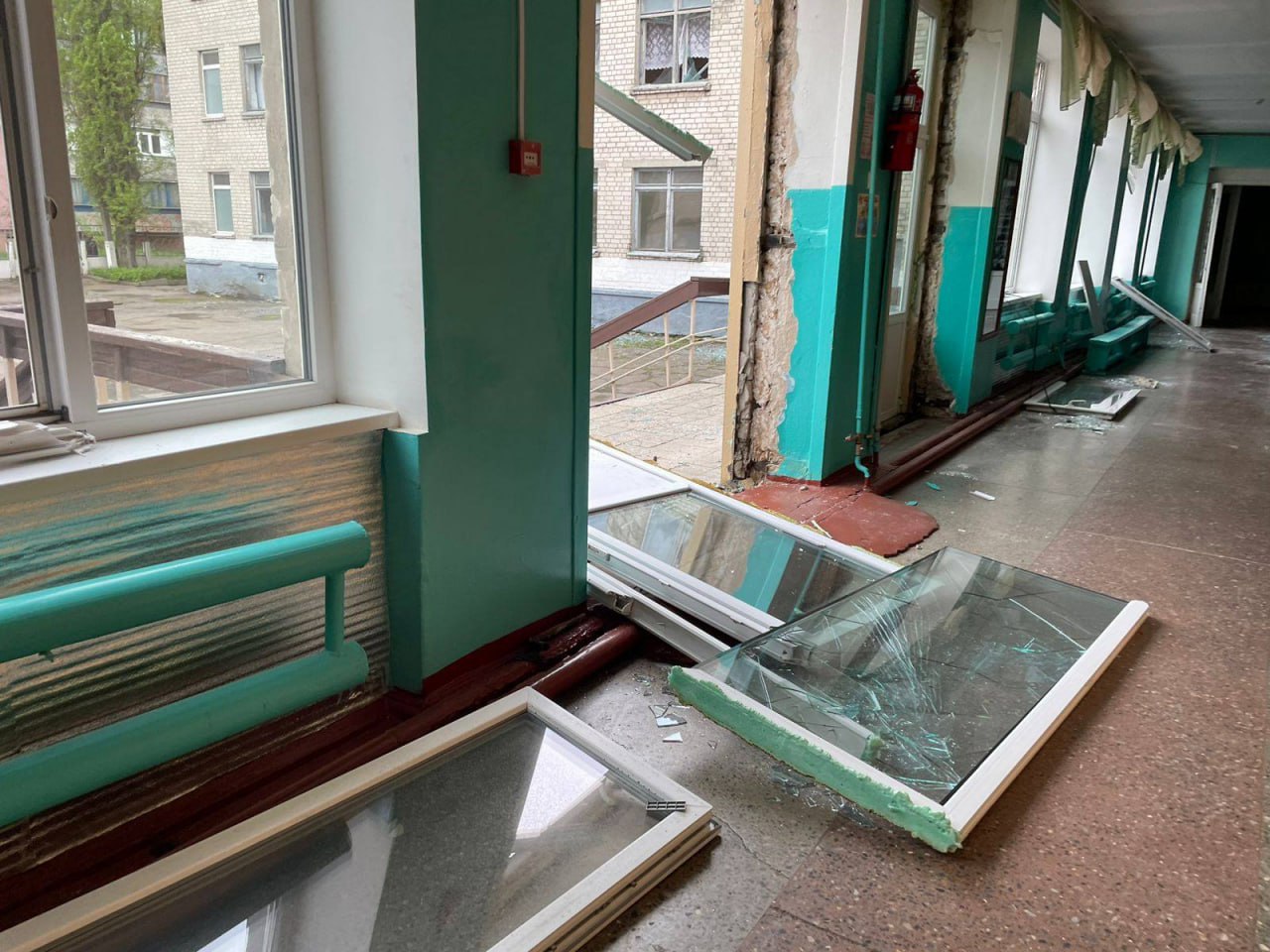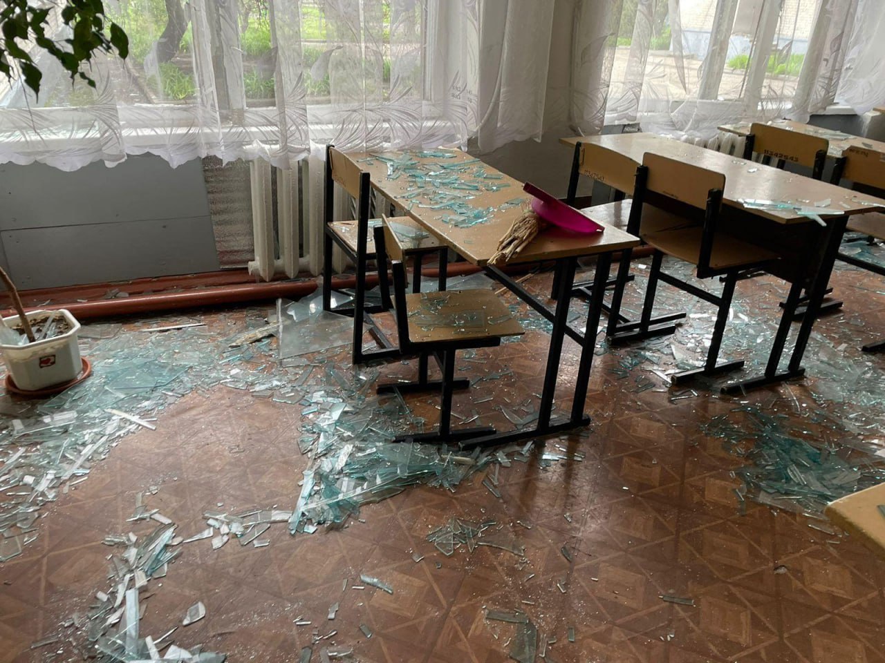 На фото видно пошкодження школи та велику вирву від снаряда в землі.