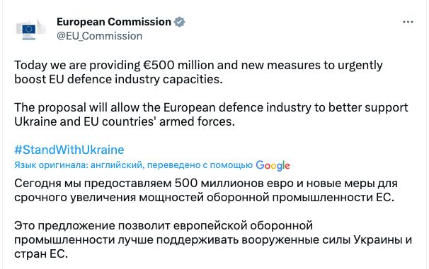 "Сьогодні ми надаємо 500 мільйонів євро та впроваджуємо нові заходи щодо термінового зміцнення потенціалу оборонної промисловості ЄС. Пропозиція дозволить європейській оборонній промисловості краще підтримувати збройні сили України та країн ЄС", - йдеться у повідомленні Єврокомісії у Твіттері.