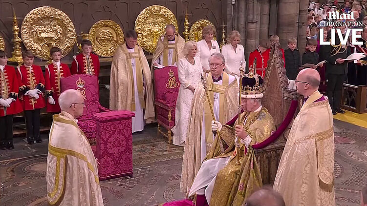 Після помазання королю вручать королівські регалії, серед яких шпори, меч, арміли (браслети) та скіпетр. Після цього Карл III буде коронований короною короля Едуарда (зроблена із золота та прикрашена понад 400 дорогоцінного каміння для коронації Карла II у 1661 році), після чого прозвучить "Боже, бережи короля!".