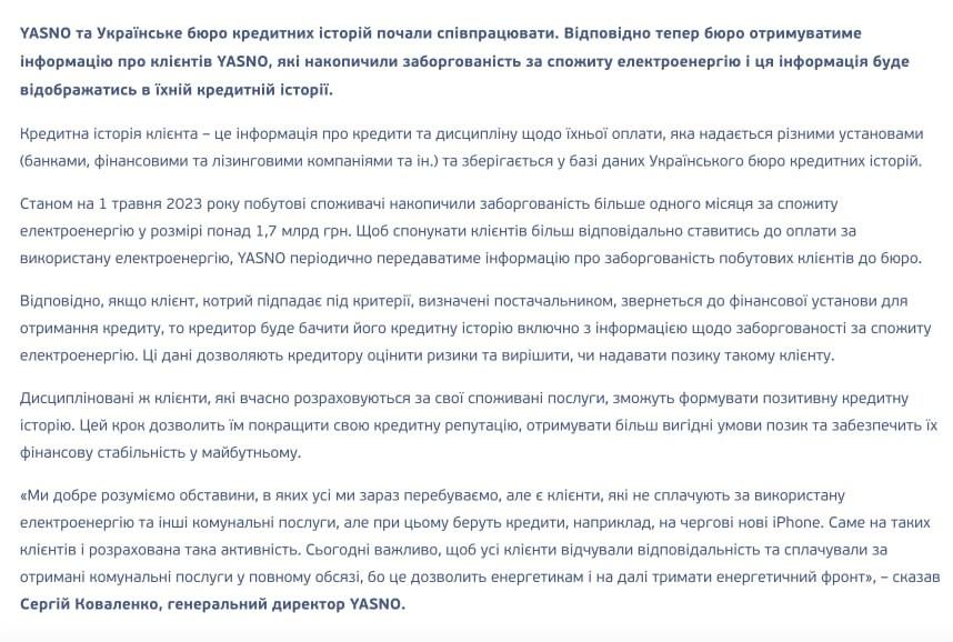 Станом на 1 травня побутові споживачі накопичили заборгованість понад один місяць за спожиту електроенергію у розмірі понад 1,7 млрд. грн. Щоб спонукати клієнтів більш відповідально ставитися до оплати за використану електроенергію, YASNO періодично передаватиме інформацію про заборгованість побутових клієнтів до Українського бюро кредитних історій.