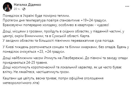 Синоптик Наталія Діденко пише, що понеділок в Україні буде помірно теплим.