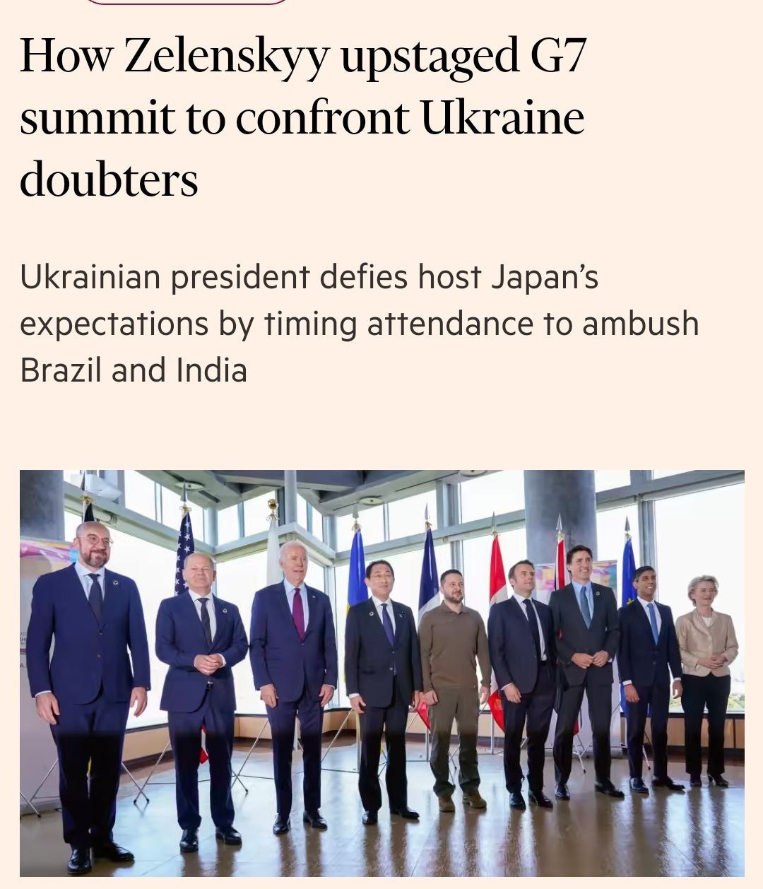 Financial Times написала, що незважаючи на прохання президента Франції Еммануеля Макрона, президент Бразилії Лула да Сільва так і не зустрівся із Зеленським на саміті G7 у Хіросімі.