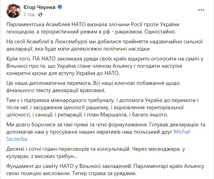 "ПА НАТО закликала уряди своїх країн відкрито оголосити на саміті у Вільнюсі про те, що Україна стане членом Альянсу та узгодити наступні конкретні кроки для вступу України до НАТО", - написав Чернев.