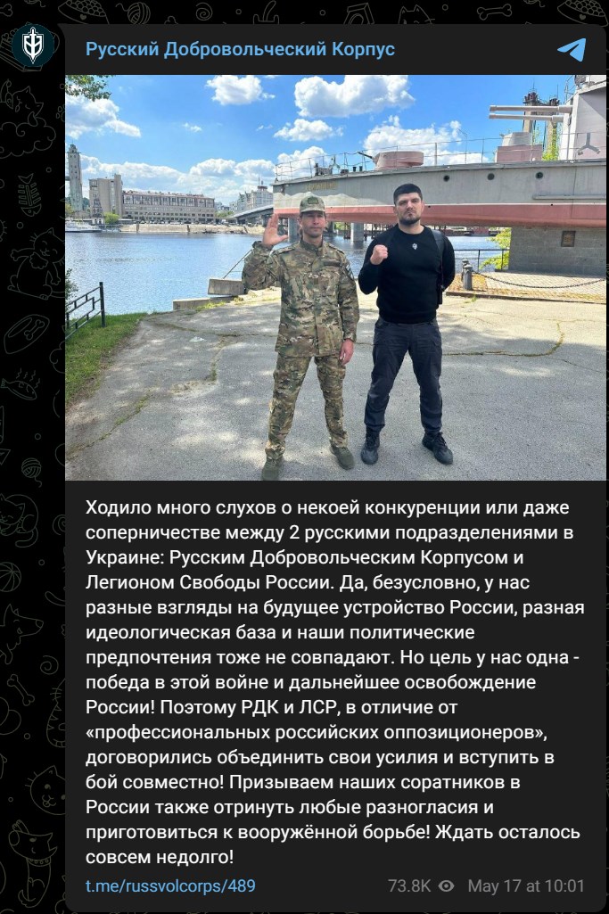 У цьому контексті цікаво, що 17 травня РДК і ЛСР опублікували в Києві спільне фото своїх лідерів, вже згаданого Капустіна і бійця, що представляє "Легіон", з позивним "Цезар" (справжнє ім'я - Максиміліан Андронников, за даними російських опозиційних ЗМІ, до РФ він входив право-монархічну організацію "Імперський легіон").