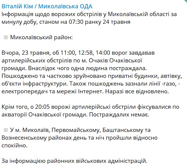 У Миколаївській області минулої доби росіяни тричі з артилерії обстріляли Очаків. В результаті одна людина постраждала.