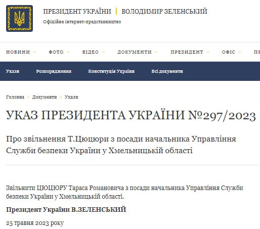 Президент України Володимир Зеленський звільнив Тараса Цюцюру з посади начальника Управління Служби безпеки України в Хмельницькій області.