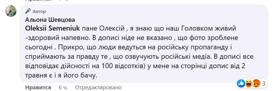 Тобто, по суті, вона визнала, що виклала вчора старе фото з головкомом. Але заявила, що точно знає - "наш головком живий-здоровий".