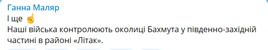 12:10 Після заяви Юрія Луценка про те, що росіяни вже повністю захопили Бахмут, заступник міністра оборони України Ганна Маляр знову сказала, що у місті ЗСУ все ще контролює південно-західну частину в районі зруйнованого пам'ятника літаку (нагадаємо, росіяни заявляють, що захопили його ще тиждень тому).