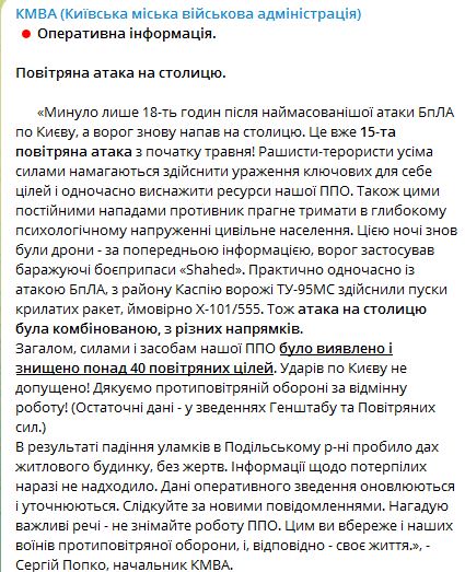 Загалом силами ППО було виявлено та знищено понад 40 повітряних цілей. Ударів по Києву не допущено.