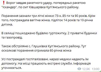 Росіяни завдали ракетного удару, попередньо ракетою "Іскандер", по селищу Ківшарівка Куп'янського району Харківської області.
