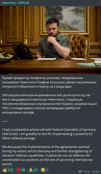 Володимир Зеленський подякував канцлеру за надання оборонного пакету на три мільярди євро, та обговорив "виконання домовленостей, досягнутих під час нещодавнього візиту до Німеччини", зокрема, надання Україні коштів ППО.