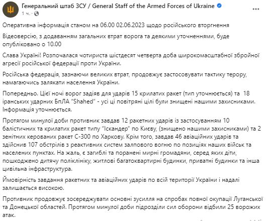 1. Попередньо цієї ночі противник запустив 15 крилатих ракет і 18 "Шахидов" - всі цілі були знищені. Минулої доби росіяни завдали 12 ракетних ударів із застосуванням 10 балістичних і крилатих ракет типу "Іскандер" по Києву та 2 зенітних керованих ракет С-300 по Харкові.