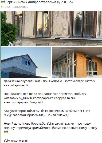 Двічі за ніч 5 червня росіяни обстріляли Нікополь. Вони обстріляли місто із важкої артилерії.