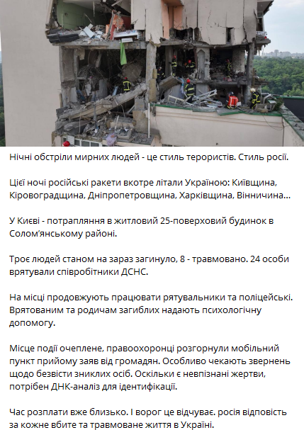 Число жертв внаслідок ракетного удару по київській багатоповерхівці в Солом'янському районі зросло з двох до трьох осіб. Станом на даний момент вісім осіб травмовано. 24 особи врятували співробітники ДСНС. Станом на 8.45 за медичною допомогою звернулося 14 осіб.