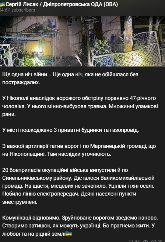 08:01 Вночі росіяни обстріляли Нікополь Дніпропетровської області, внаслідок чого поранено 47-річного чоловіка. Крім того, пошкоджено 3 приватні будинки та газопровід.