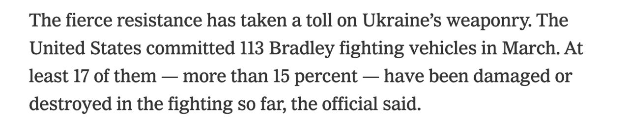 Джерело The New York Times в уряді США підтверджує втрату щонайменше 17 американських БМП Bradley українськими Збройними силами під час контрнаступу.