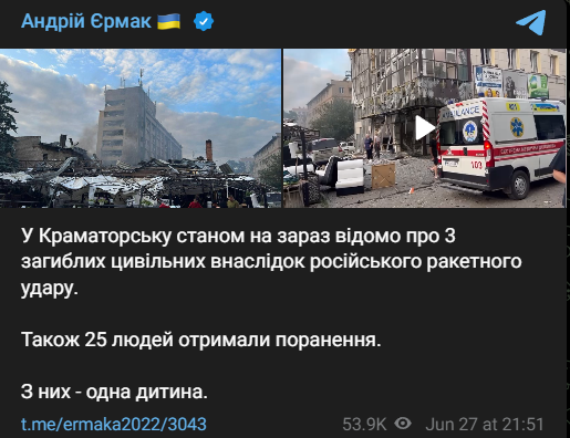 Станом на даний момент у Краматорську відомо вже про трьох загиблих цивільних внаслідок російського ракетного удару, повідомляє голова ВП Андрій Єрмак. 25 людей отримали поранення. З них одна дитина.