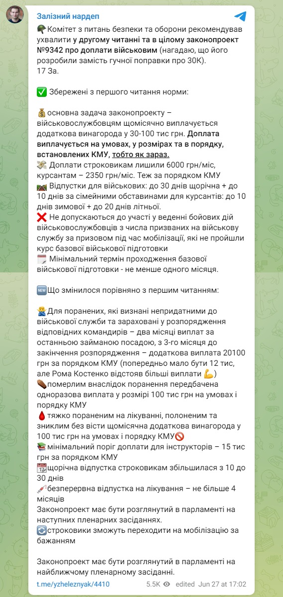 Як пише Железняк, військовослужбовцям щомісяця виплачують додаткову винагороду в 30-100 тисяч гривень, проте розмір та порядок доплати встановлює Кабмін.