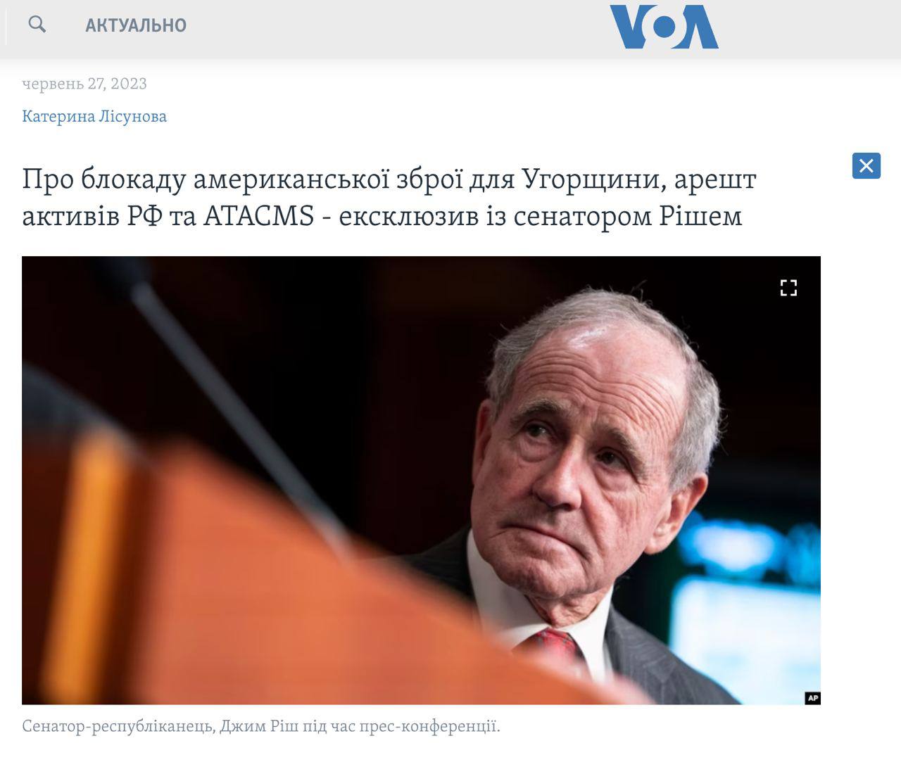 Про це заявив американський сенатор-республіканець Джим Ріш в інтерв'ю "Голосу Америки".