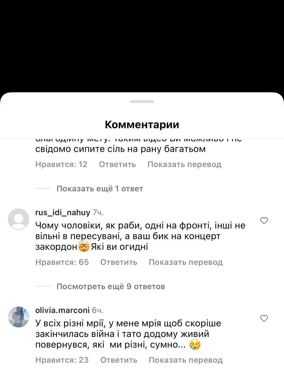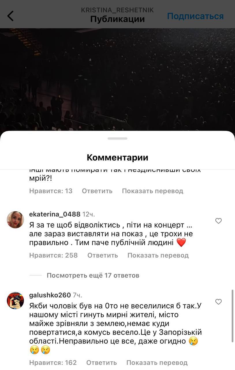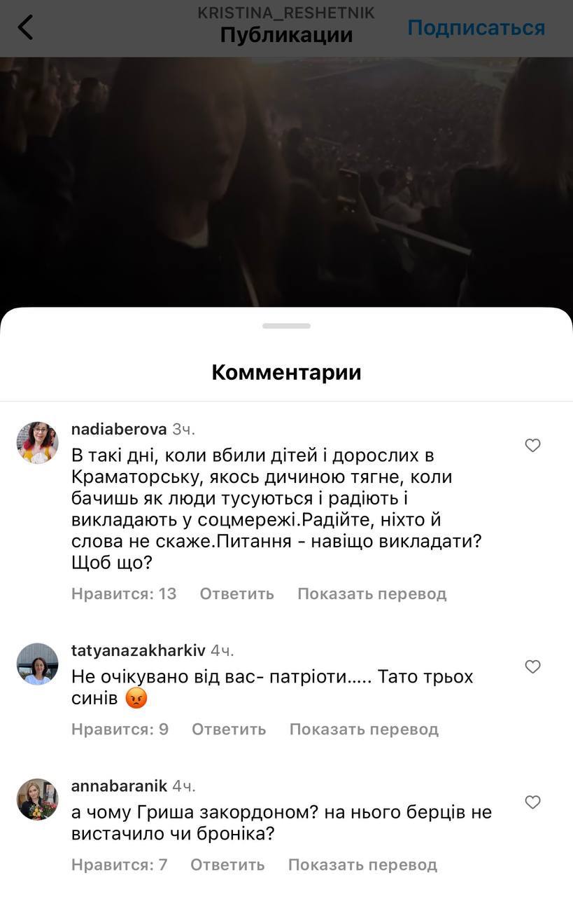 "Якби чоловік був на "нулі", не веселився б так. У нашому місті гинуть мирні жителі, місто майже зрівняли із землею, нікуди повертатися, а комусь весело. Це на Запоріжжі. Неправильно це все, огидно"; "А чому Гриша за кордоном? На нього берців не вистачило чи броника?"; "Чому чоловіки, як раби, одні на фронті, інші не вільні в пересуванні, а ваш бик на концерт за кордон... Які ви огидні", - пишуть люди.