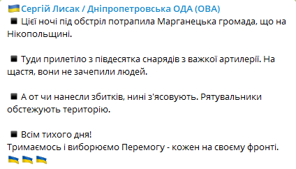 Цієї ночі під обстріл потрапила Марганецька громада Нікопольщини Дніпропетровської області. До населеного пункту прилетіло з півдесятка снарядів із важкої артилерії. На щастя, ніхто із людей не постраждав.