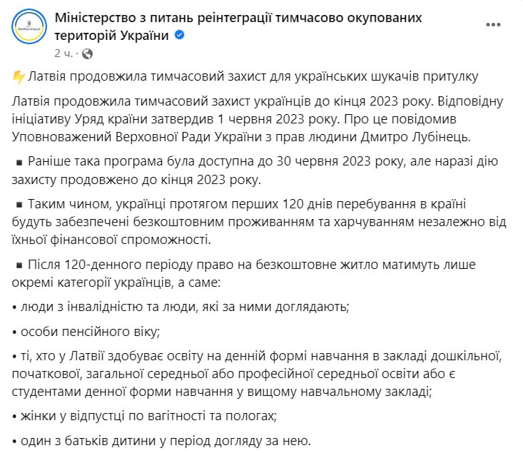 Латвія продовжила тимчасовий захист українських біженців до кінця 2023 року. Відповідну ініціативу уряд країни затвердив 1 червня цього року.