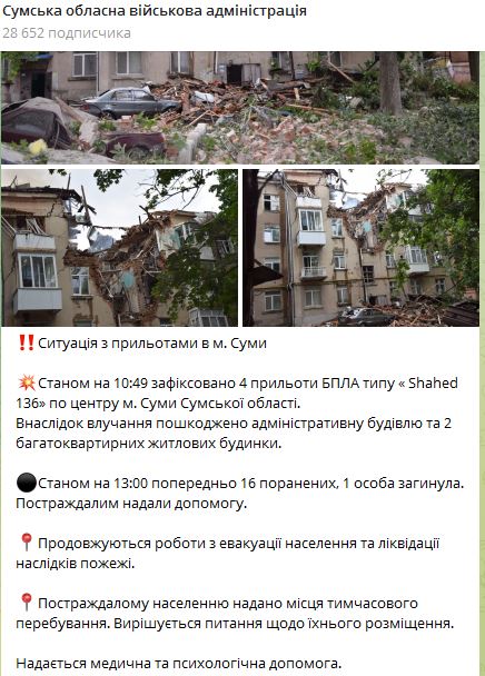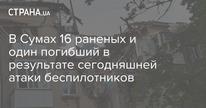 У Сумах повідомляють про 16 поранених та одного загиблого внаслідок сьогоднішньої атаки безпілотників.