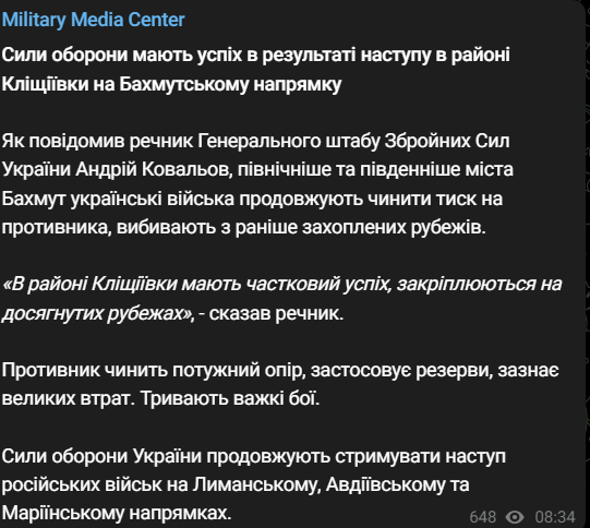 Генштаб повідомляє про успіхи ЗСУ в районі Кліщіївки, на південь від Бахмута. Українські війська продовжують чинити тиск на противника на південному та північному флангах Бахмута, вибиваючи із раніше захоплених рубежів.