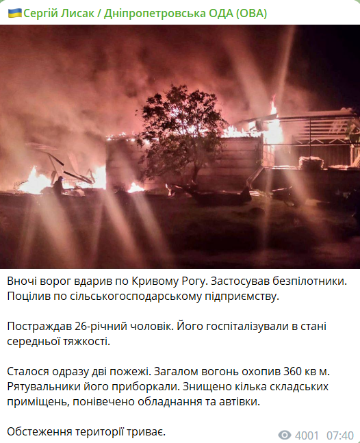 07:48 Вночі безпілотники вдарили по Кривому Розі. Є приліт із сільськогосподарського підприємства.