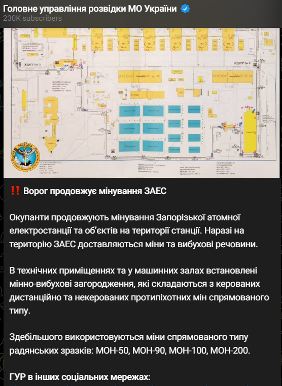 "У технічних приміщеннях та машинних залах встановлені мінно-вибухові загородження, які складаються з керованих дистанційно та некерованих протипіхотних мін спрямованого типу.