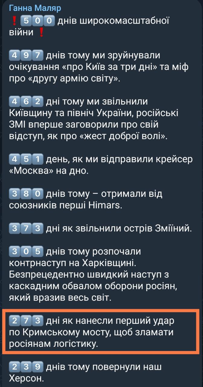 Вона вказала, що минуло 273 дні, "як завдали першого удару Кримським мостом, щоб зламати росіянам логістику".